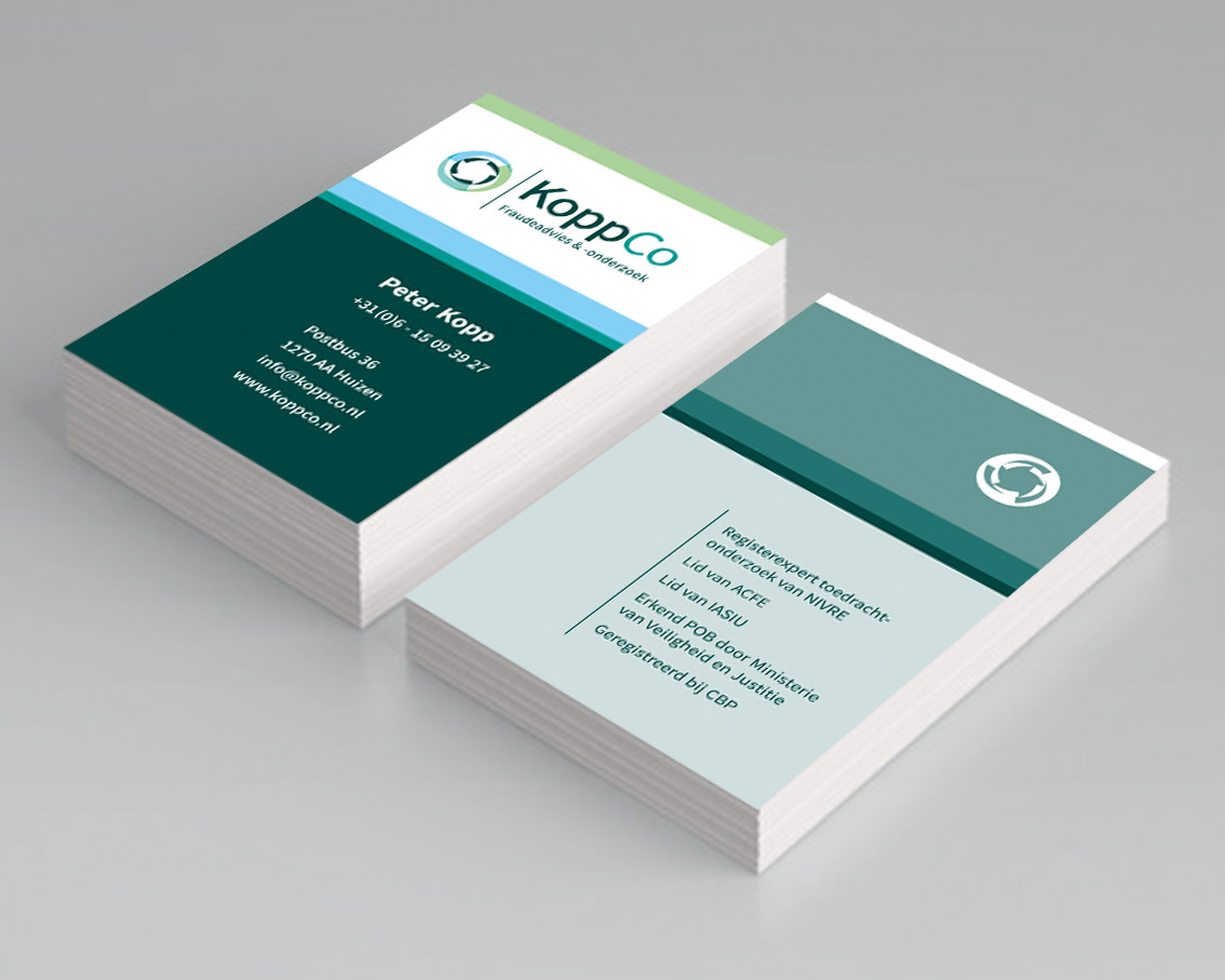 Logo, huisstijl incl visits, briefpapier en adresstickers KoppCo Fraude-advies. De 3 en 5 elementen in de cirkel hebben een speciale betekenis voor de oprichter.